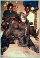 dos patas, y era más alto que ella, que mide 1,80 m. Karl Amman dice que estos animales tienen pies por lo menos cinco centímetros mayores que el promedio de los gorilas y que su rostro es más plano. Además de dormir en grandes refugios armados en el suelo, cosa que los chimpancés jamás hacen, pues descansan en los árboles para protegerse de los depredadores, el misterioso simio aúlla cuando sale la Luna y cuando se pone. Williams explicó que esto jamás lo harían los chimpancés, por miedo a atraer a leones o hienas. Duane Rumbaugh, docente de la Georgia State University, dijo "No debemos dejar fuera la posibilidad de que sea una nueva especie de simio, una subespecie o algún tipo de híbrido". Ed Louis, genético conservacionista del Zoológico Henry Doorly de Omaha, Nebraska, en los Estados Unidos, dijo "El descubrimiento de un nuevo primate es una gran cosa, un nuevo simio sería increíble".